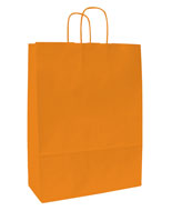 Buste in carta kraft bianco fondo colorato arancio con manici in cordino di carta intrecciata arancio incollati.