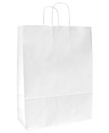 Buste in carta kraft bianco con manici in cordino di carta intrecciata bianchi incollati.
