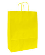 Buste in carta kraft bianco fondo colorato giallo con manici in cordino di carta intrecciata gialli incollati.
